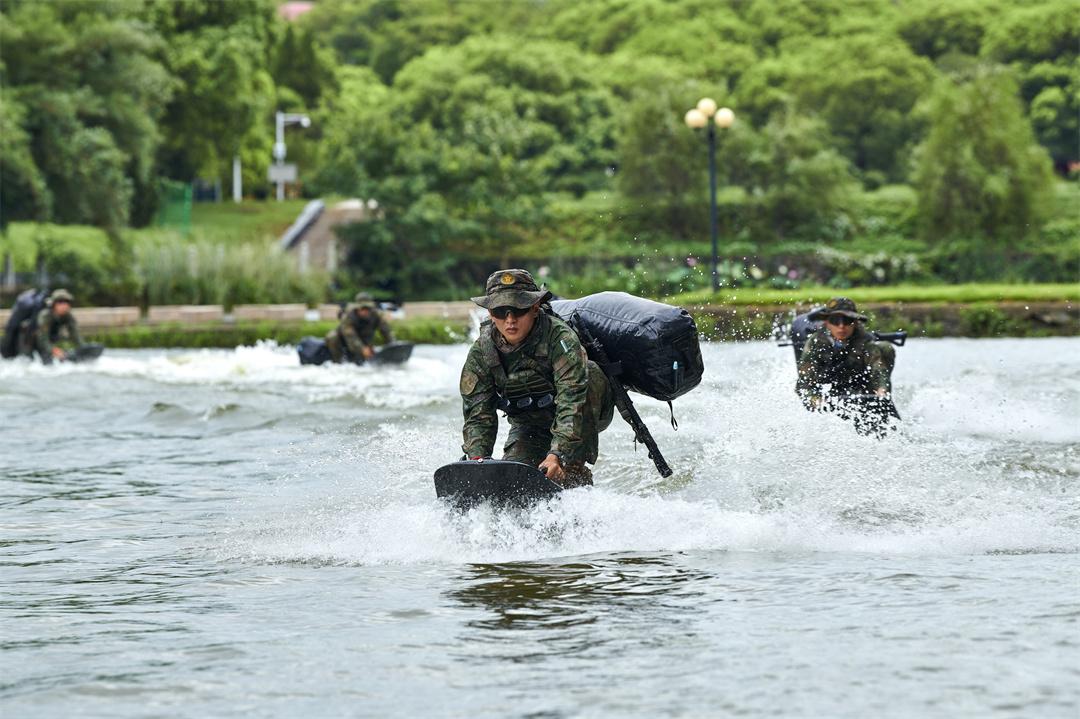 硝煙還未散去,一只形態(tài)逼真的仿生鳥開始在空中盤旋,吸引了眾人目光。通過仿生鳥反饋的畫面確認(rèn)前方態(tài)勢(shì)后,海軍小隊(duì)蛙人從水面浮出,迅速站上水上電動(dòng)滑板踏浪而行,上岸后又換上陸地電動(dòng)滑板迅速進(jìn)入戰(zhàn)場(chǎng),與“敵人”展開激戰(zhàn)。
