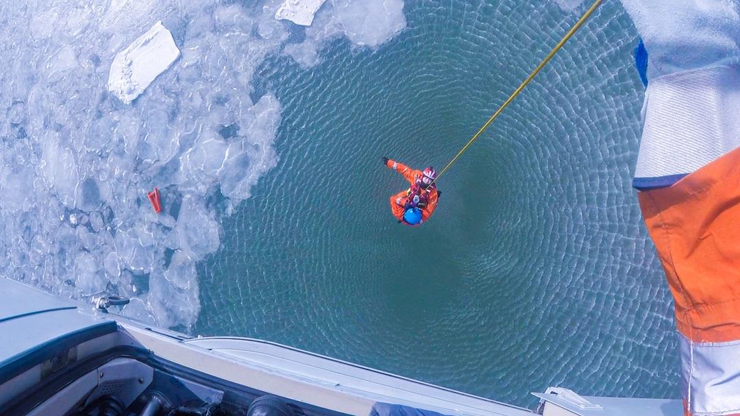 “讓我上!”張闖毫不猶豫第一個報名。訓(xùn)練當(dāng)天寒風(fēng)刺骨,海風(fēng)刮在張闖臉上如刀割一樣。高空之下,海面上浮冰像斷裂的大網(wǎng),風(fēng)大浪大,一塊塊浮冰就像拋了錨的小船一樣起伏不定,強烈的壓迫感瞬間向張闖襲來。