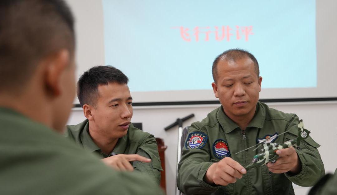 圖為張闖(右一)與戰(zhàn)友進行飛行講評。