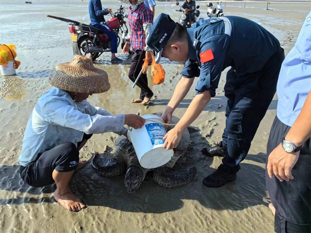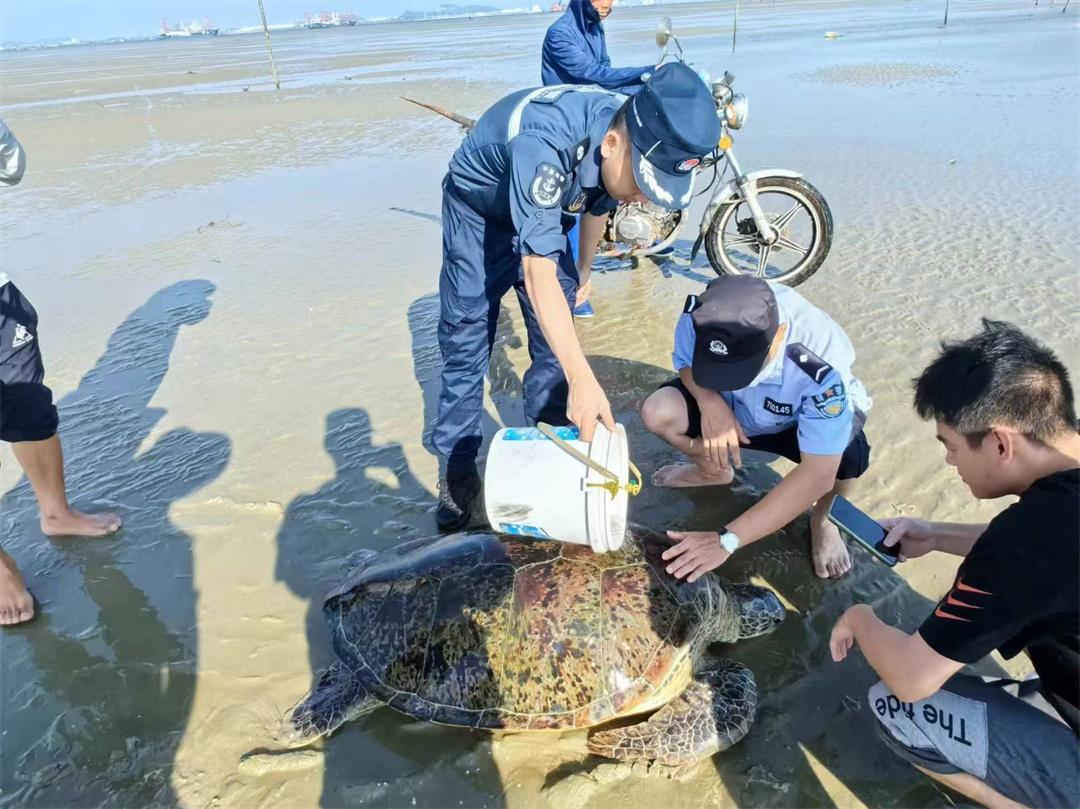 8月6日,廣東茂名海警局濱海工作站聯(lián)合駐地博賀派出所,在博賀港旅游碼頭附近海域成功救助一只擱淺海龜,并將其放生回歸海洋。