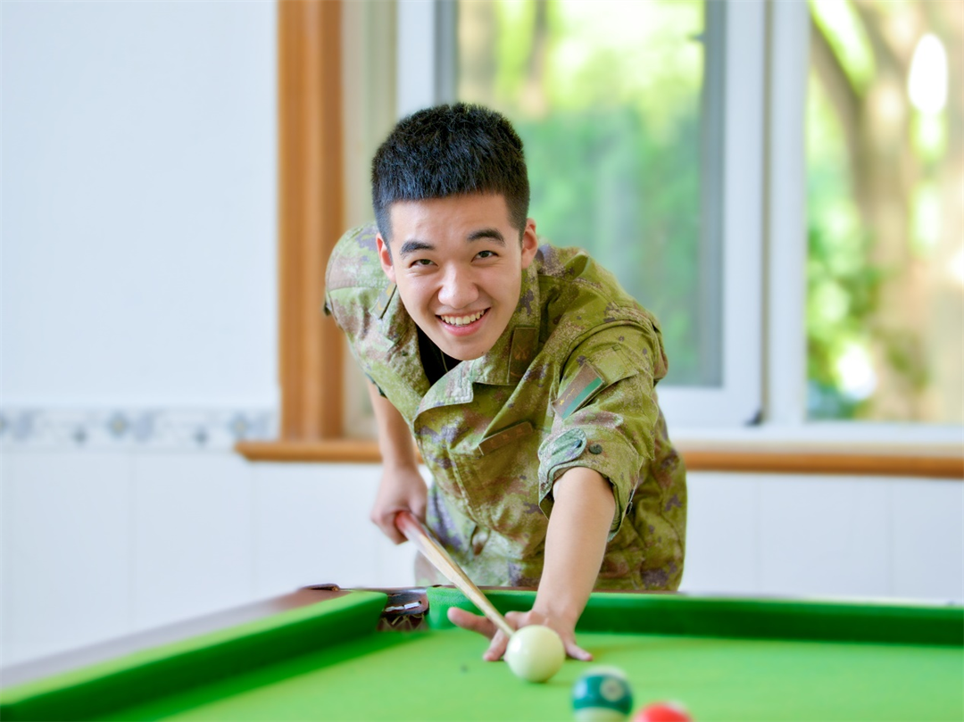 圖為下士吳凱翔在臺(tái)球室最后一次與戰(zhàn)友PK。