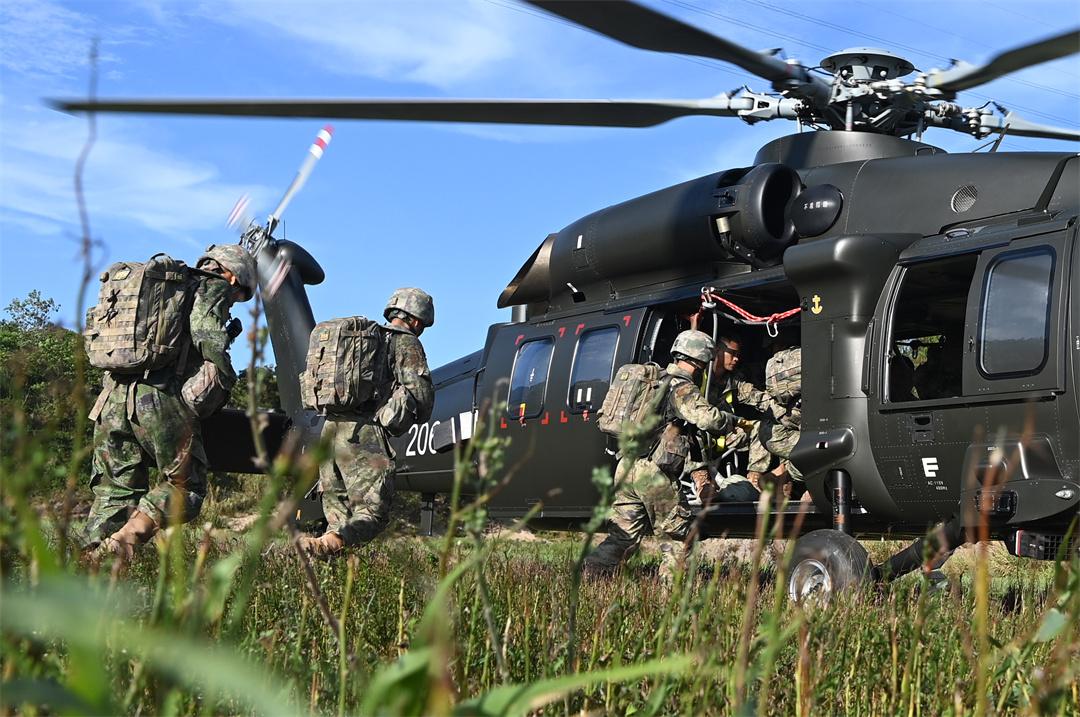 圖為直升機搭載作戰(zhàn)隊員飛赴機降地域。