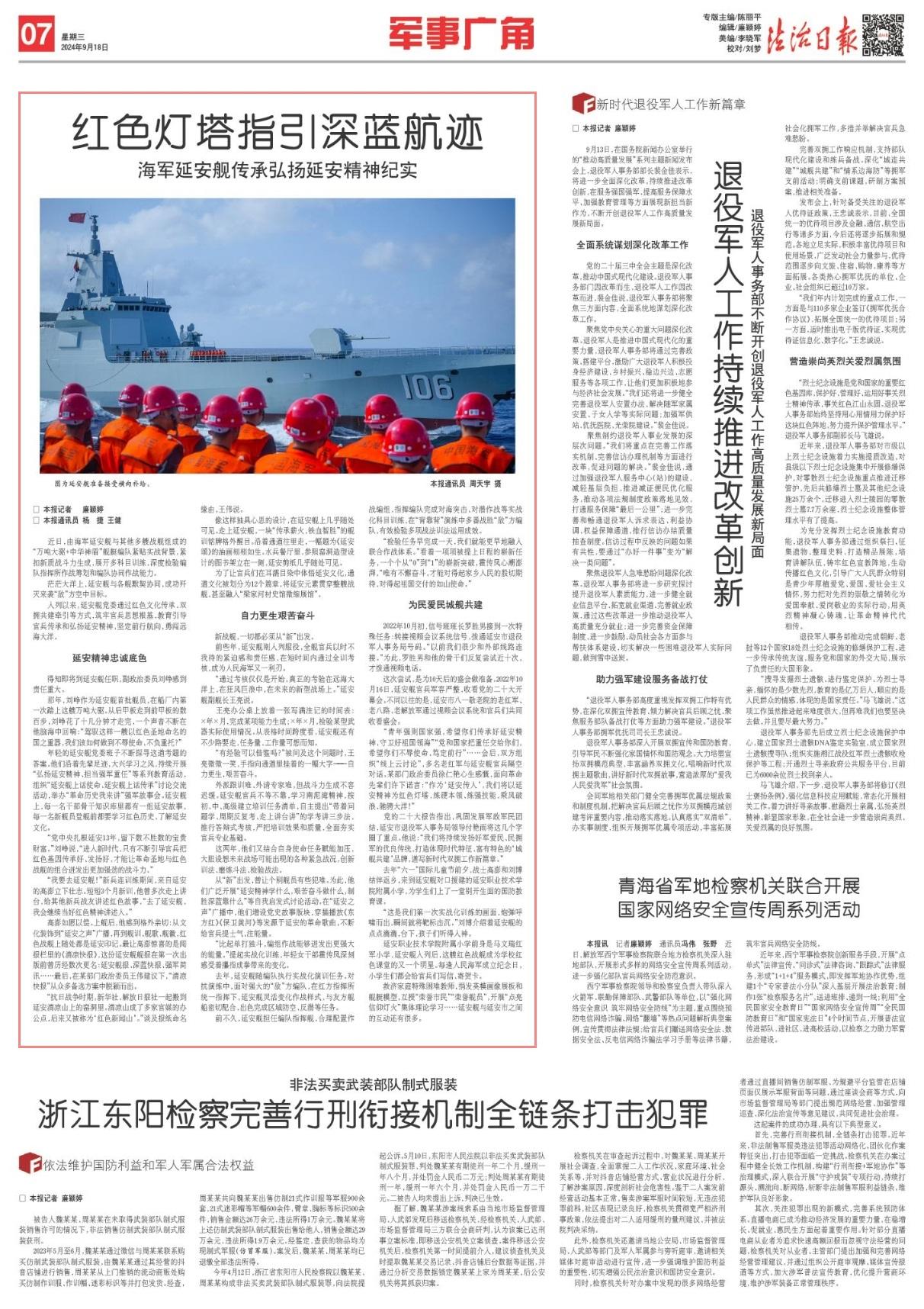 “青年強則國家強,希望你們傳承好延安精神,守衛(wèi)好祖國領?!薄包h和國家把重任交給你們,希望你們不辱使命、篤定前行”……會后,雙方組織“線上云討論”,多名老紅軍與延安艦官兵隔空對話。某部門政治委員徐仁艷心生感慨,面向革命先輩們許下諾言:“作為‘延安傳人’,我們將以延安精神為紅色燈塔,練硬本領、練強技能,乘風破浪、馳騁大洋!”