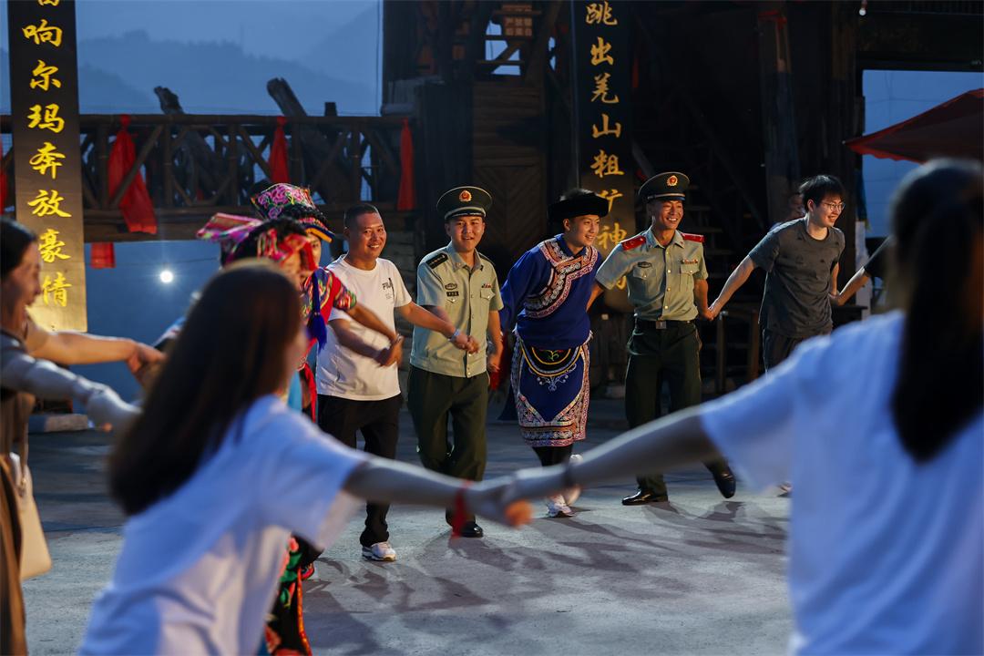 圖為武警官兵與村里的繡娘合唱羌族歌曲。