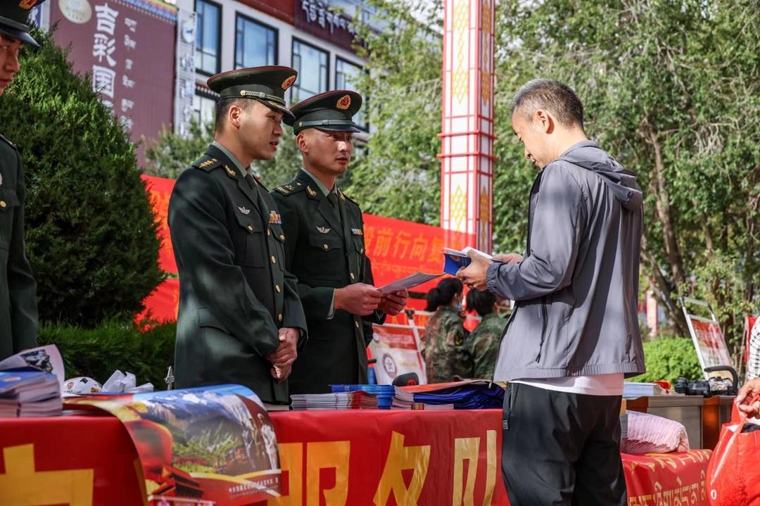圖為解放軍拉薩軍事法院和西藏拉薩警備區(qū)官兵向群眾宣傳國防知識。黎遠(yuǎn)華 攝