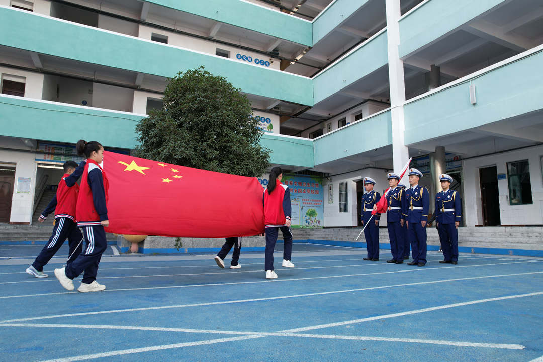 活動(dòng)現(xiàn)場(chǎng),由徐明峽護(hù)送的這面承載特殊歷史意義的五星紅旗,被依次傳遞到優(yōu)秀共青團(tuán)員代表和少先隊(duì)員代表手中,最后交由丹江口市消防救援大隊(duì)指戰(zhàn)員進(jìn)行升旗。
