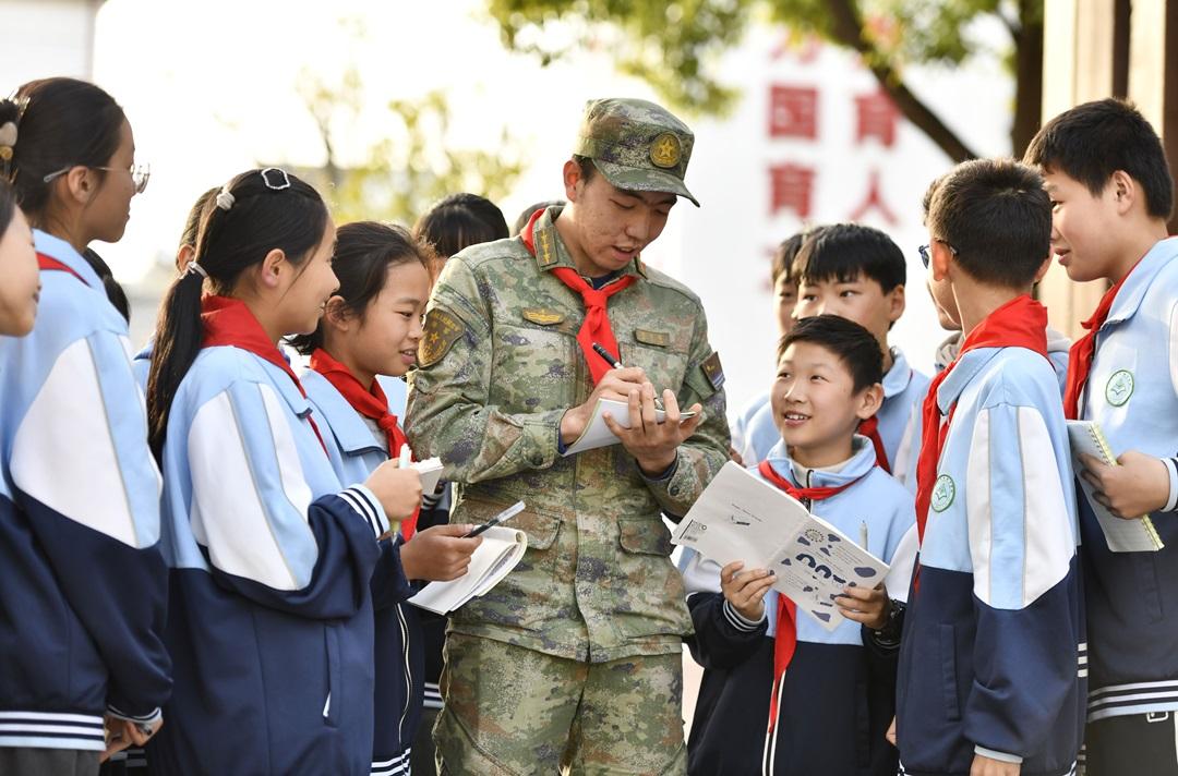 圖為在肥東縣長臨河學校中心小學,某部指導員魏力源給孩子們寫寄語。