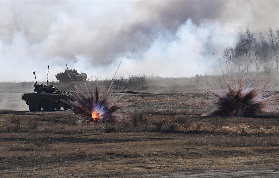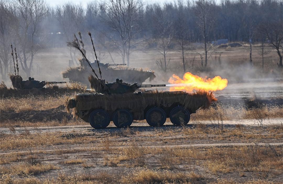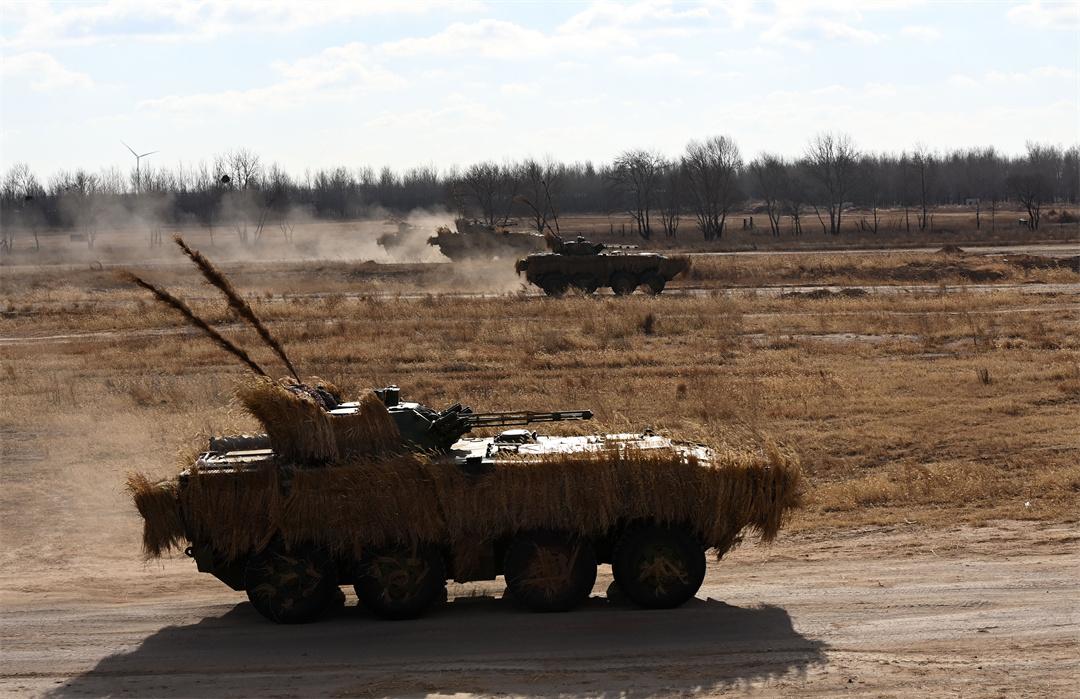 圖為“百戰(zhàn)百勝營(yíng)”官兵駕駛步戰(zhàn)車進(jìn)行實(shí)彈戰(zhàn)術(shù)綜合演練。