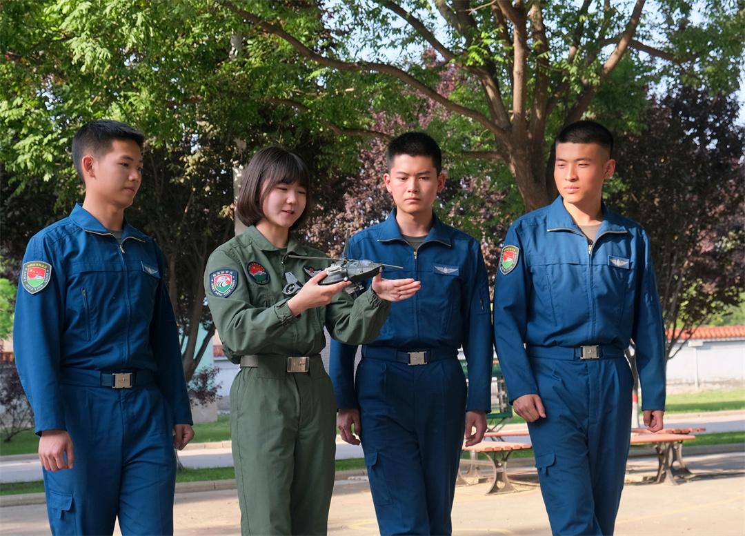 圖為女飛行教員劉玥瑋(左二)為男飛行學員講授飛行戰(zhàn)術(shù)動作。