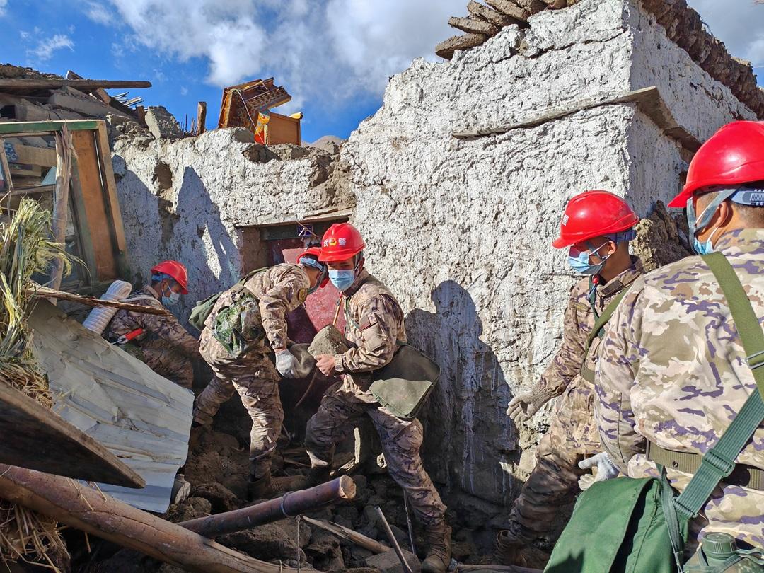 圖為武警西藏總隊(duì)日喀則支隊(duì)官兵在定日縣長所鄉(xiāng)嘎丹村搶救群眾財(cái)產(chǎn)。張鈺 攝