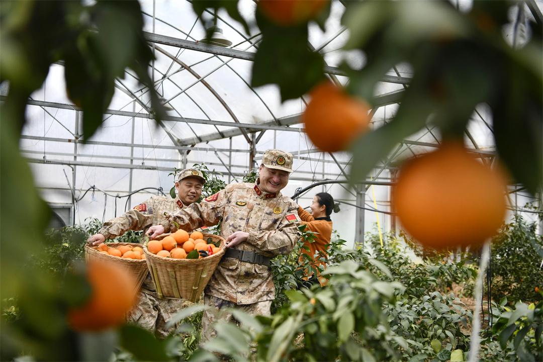1月9日,安徽省合肥市廬江縣人武部組織“民兵助農(nóng)志愿者小分隊(duì)”,來(lái)到廬江縣羅河鎮(zhèn)鮑店村幫助果農(nóng)采收冬橙,搶抓時(shí)節(jié)供應(yīng)市場(chǎng)。圖為民兵在鮑店村幫果農(nóng)采摘冬橙。