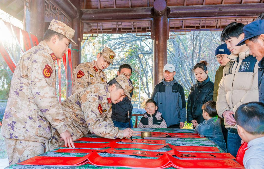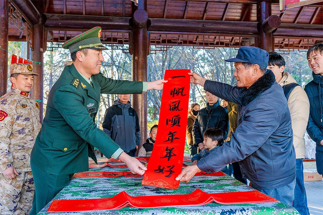 1月15日,安徽省馬鞍山市博望區(qū)人武部組織現(xiàn)役官兵、文職人員、基干民兵走進(jìn)村鎮(zhèn)文化中心廣場(chǎng),開展“寫春聯(lián)·送祝?!び麓骸蔽繂枌m?xiàng)活動(dòng)。圖為官兵給駐地群眾送上新春祝福。