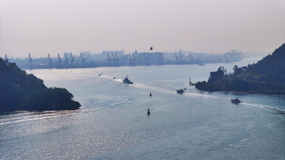 圖為直升機(jī)掠過艦艇上方。蘇杰 攝