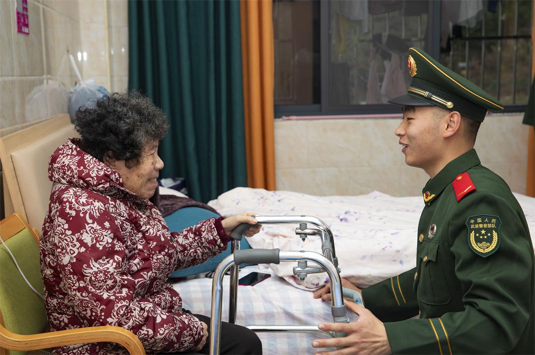 圖為武警官兵幫老人整理房間衛(wèi)生。