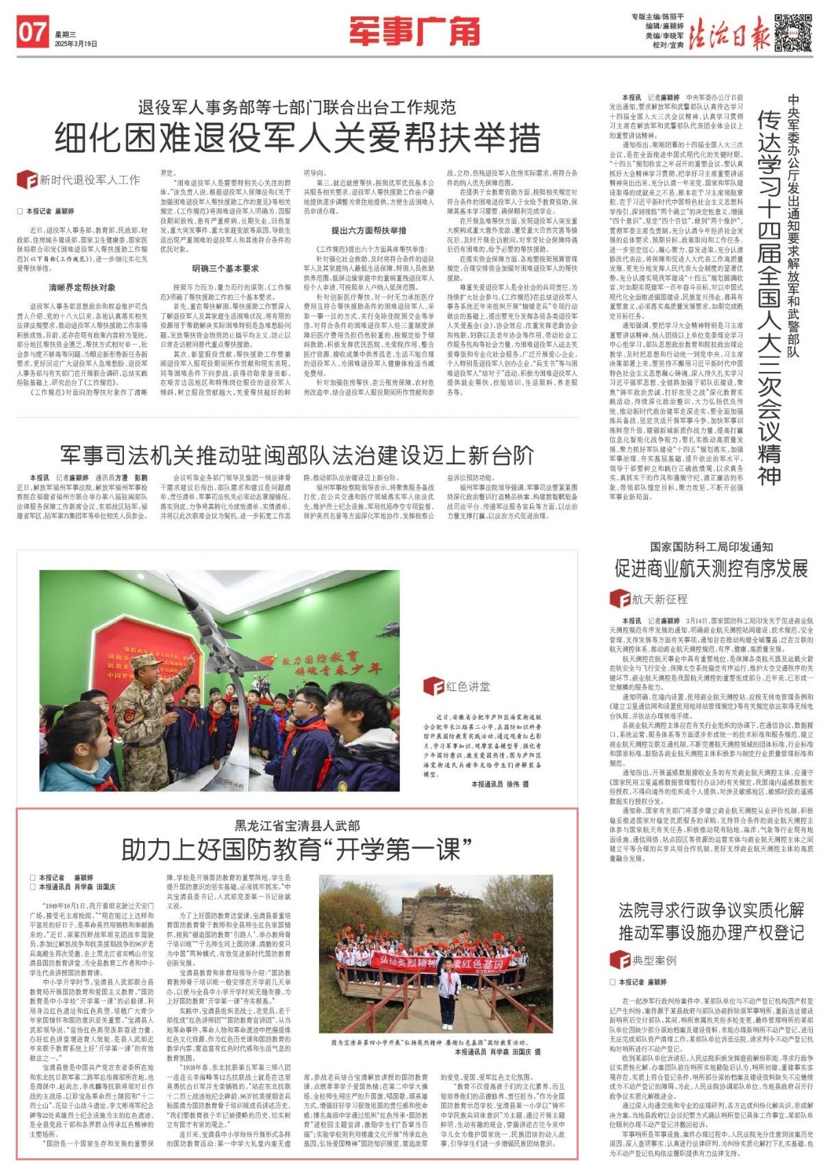 連日來(lái),寶清縣中小學(xué)紛紛開(kāi)展形式各樣的國(guó)防教育活動(dòng):第一中學(xué)大禮堂內(nèi)座無(wú)虛席,參戰(zhàn)老兵結(jié)合寶清解放講授的國(guó)防教育課,點(diǎn)燃莘莘學(xué)子愛(ài)國(guó)熱情;在第二中學(xué)大操場(chǎng),全校師生用莊嚴(yán)的升國(guó)旗、唱國(guó)歌、頌英雄方式,增強(qiáng)好好學(xué)習(xí)報(bào)效祖國(guó)的責(zé)任感和使命感;博名高級(jí)中學(xué)通過(guò)組織“紅色傳承·國(guó)防教育”進(jìn)校園主題宣講,激勵(lì)學(xué)生們“吾輩當(dāng)自強(qiáng)”;實(shí)驗(yàn)學(xué)校則利用樓廊文化開(kāi)展“傳承紅色基因、弘揚(yáng)愛(ài)國(guó)精神”國(guó)防知識(shí)展覽,營(yíng)造濃厚的愛(ài)黨、愛(ài)國(guó)、愛(ài)軍紅色文化氛圍。