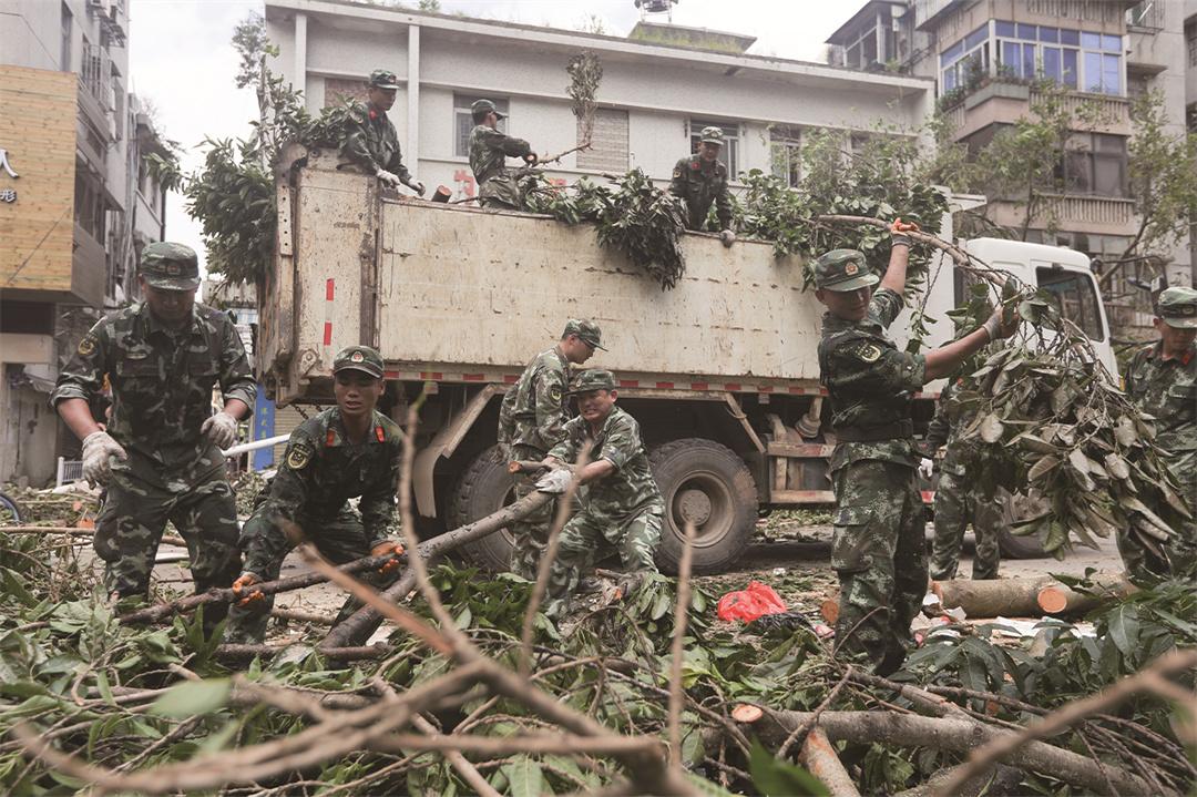 “紅色前哨連”聞令而動(dòng),官兵們?cè)邶R腰深的海水中摸索前行,赤腳涉險(xiǎn)1公里抵達(dá)災(zāi)區(qū)。面對(duì)情侶路被海水倒灌、樹(shù)木橫阻的險(xiǎn)情,60余名官兵連續(xù)3天每天奮戰(zhàn)10小時(shí),用斧頭劈開(kāi)倒伏樹(shù)干,徒手搬運(yùn)數(shù)百斤樹(shù)枝,清理被淹車輛十余臺(tái),轉(zhuǎn)移群眾30余人,疏通情侶南路3.7公里。