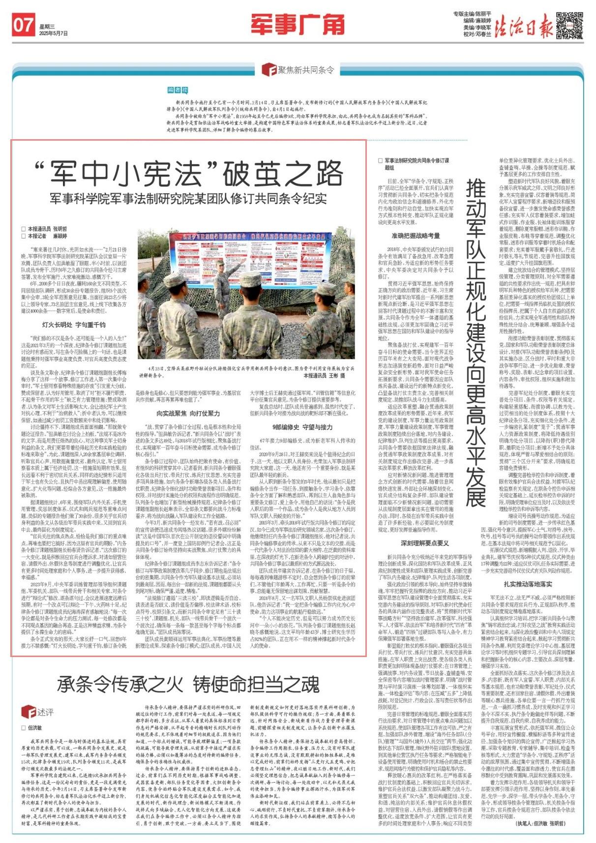 共同條令被稱為“軍中小憲法”,自1958年起至今已先后編修9次,均由軍事科學院承擔,由此,共同條令也成為名副其實的“軍科品牌”。新共同條令是貫徹依法治軍戰(zhàn)略的重大舉措,是構建中國特色軍事法治體系的重要成果,標志著軍隊法治化水平邁上新臺階。近日,記者走進軍事科學院某團隊,詳細了解條令編修的幕后故事。