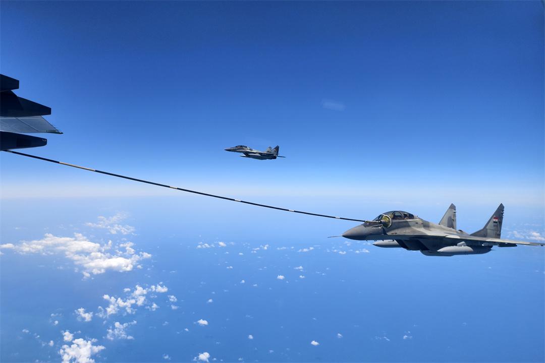 圖為4月28日,參加中埃“文明之鷹-2025”空軍聯(lián)合訓(xùn)練的中國(guó)空軍運(yùn)油-20飛機(jī)和埃及空軍米格-29飛機(jī)進(jìn)行空中加油訓(xùn)練。余紅春 攝