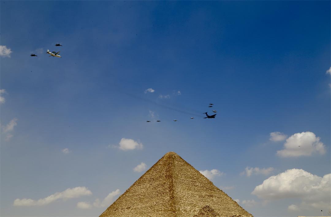 圖為中??哲婏w機(jī)組成編隊(duì)飛過(guò)金字塔。