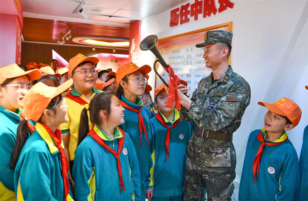 圖為在軍營開放日活動中,中隊?wèi)?zhàn)士向?qū)W生講述老軍號的故事。徐偉 攝