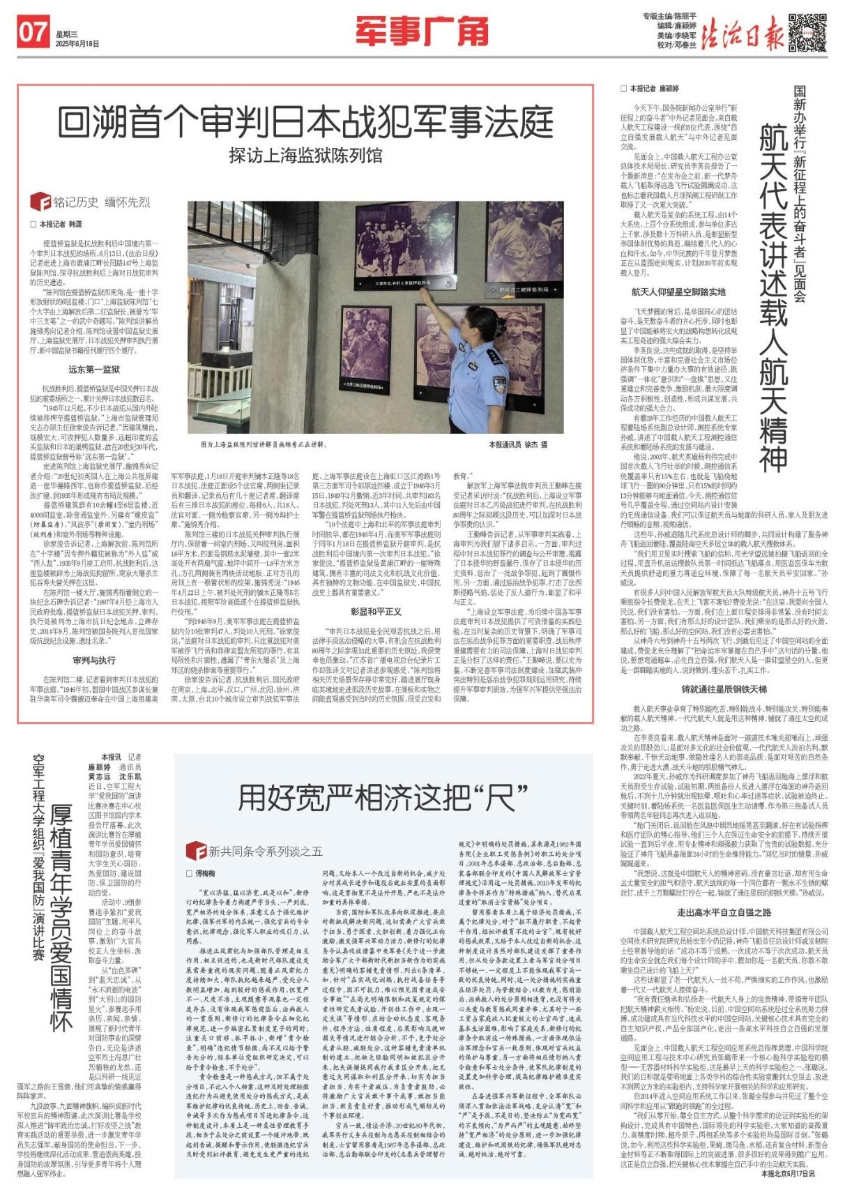 “上海設(shè)立軍事法庭,為后續(xù)中國各軍事法庭審判日本戰(zhàn)犯提供了可資借鑒的實踐經(jīng)驗。在當(dāng)時復(fù)雜的歷史背景下,明確了軍事司法在懲治戰(zhàn)爭犯罪方面的重要職責(zé)。戰(zhàn)后秩序重建需要有力的司法保障,上海對日戰(zhàn)犯審判正是分擔(dān)了這樣的責(zé)任?!蓖跚诜逭f,要以史為鑒,不斷完善軍事司法制度建設(shè),加強(qiáng)武裝沖突法特別是懲治戰(zhàn)爭犯罪規(guī)則運(yùn)用研究,持續(xù)提升軍事審判質(zhì)效,為強(qiáng)軍興軍提供堅強(qiáng)法治保障。