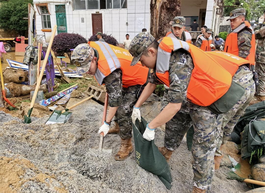 18時50分,武警百色支隊官兵依據(jù)預(yù)案出動15名官兵,攜帶鐵鏟、鐵鎬、救生衣等各類搶險救援裝備,采取摩托化方式機(jī)動前往受災(zāi)地域,協(xié)助當(dāng)?shù)乜h政府擔(dān)負(fù)搶險救災(zāi)任務(wù)。