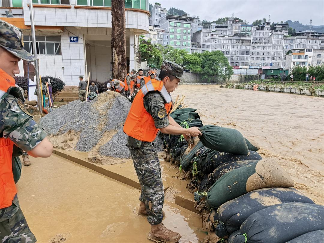 19時05分,任務(wù)官兵到達(dá)現(xiàn)場后發(fā)現(xiàn)河流湍急,迅速采取壘筑防汛沙袋的方式加固堤壩,有效延緩洪水灌入速度。