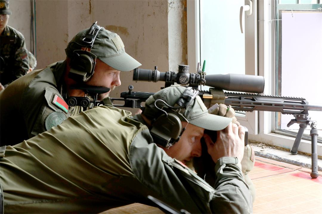 圖為7月17日,白俄羅斯參賽隊員在新疆烏魯木齊武警部隊某訓(xùn)練基地參加“城市要點控守狙擊”課目競賽。趙俊杰 攝