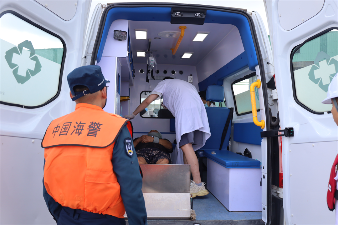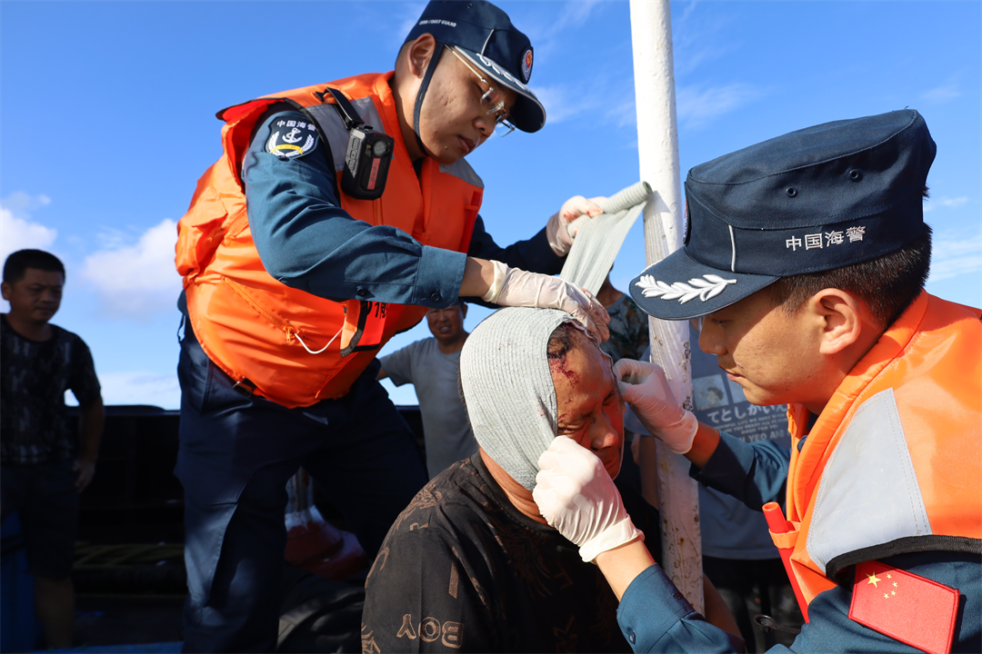 中國海警局直屬第三局橫琴艦接警后立即組織航渡救援,克服夜航能見度較差以及2米海浪的惡劣海況,快速馳援。抵達(dá)現(xiàn)場后,橫琴艦兩名海警醫(yī)務(wù)人員對傷員迅速進(jìn)行救治,實(shí)施止血包扎、口服補(bǔ)液等緊急醫(yī)療措施,及時有效穩(wěn)定了傷員狀況。