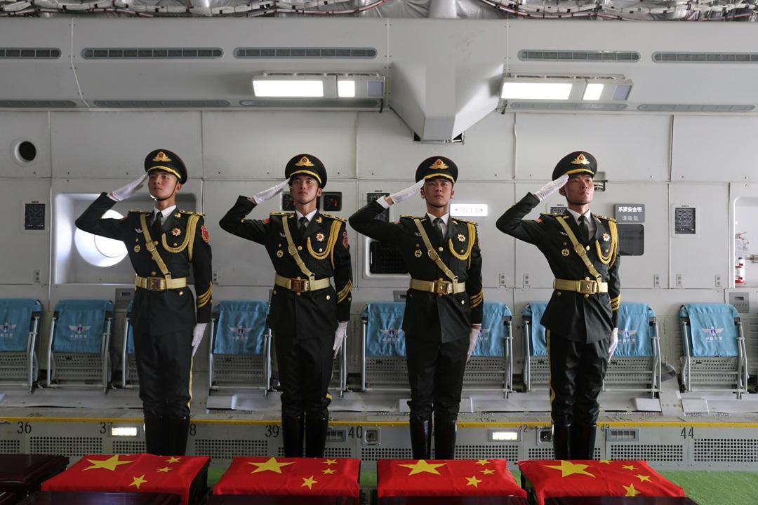 圖為中國空軍運-20機艙內(nèi)禮兵面向志愿軍英烈棺槨敬禮。王鴻飛 攝