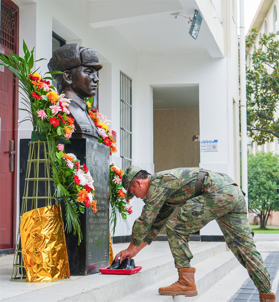 在紀(jì)念活動(dòng)現(xiàn)場,齊步、俯身放鞋、敬禮……今年參加閱兵任務(wù)的排長魏一涵,小心翼翼托著那雙通過天安門的皮鞋,俯身放在老排長銅像前。這一刻,老排長終于圓夢。