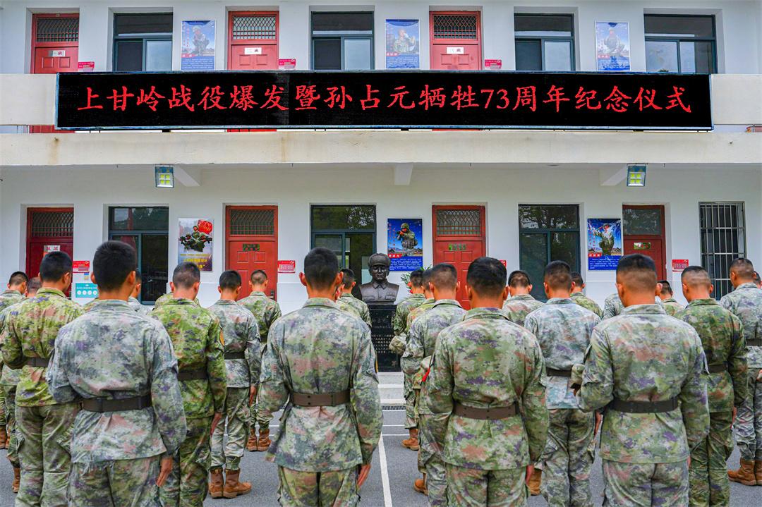 紀(jì)念儀式開始,連隊(duì)官兵仔細(xì)整理花籃綢帶,并脫帽默哀,深切緬懷孫占元老排長。花籃上“紀(jì)念上甘嶺戰(zhàn)役爆發(fā)73周年”“紀(jì)念一級英雄孫占元犧牲73周年”的綢帶隨風(fēng)飄揚(yáng)。