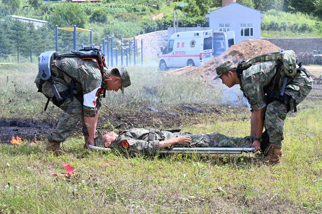 圖為“綠盾”特色民兵分隊使用外骨骼設(shè)備進行戰(zhàn)場傷員救治課目演示。