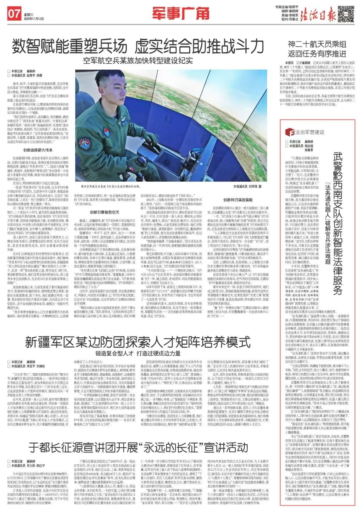 今年初,武警黔西南支隊黨委將“法務(wù)通機(jī)器人”作為創(chuàng)新普法形式、拓寬服務(wù)渠道的重要抓手,同步納入“常態(tài)法律服務(wù)下基層”工作體系,與“六座連心橋”(心理困惑橋、伙食問題橋、法律疑問橋、違紀(jì)苗頭橋、傷病困擾橋、打罵體罰橋)中的“法律疑問橋”深度銜接,讓智能法律服務(wù)既扎根基層日常,又成為連通官兵需求與法治保障的關(guān)鍵紐帶。