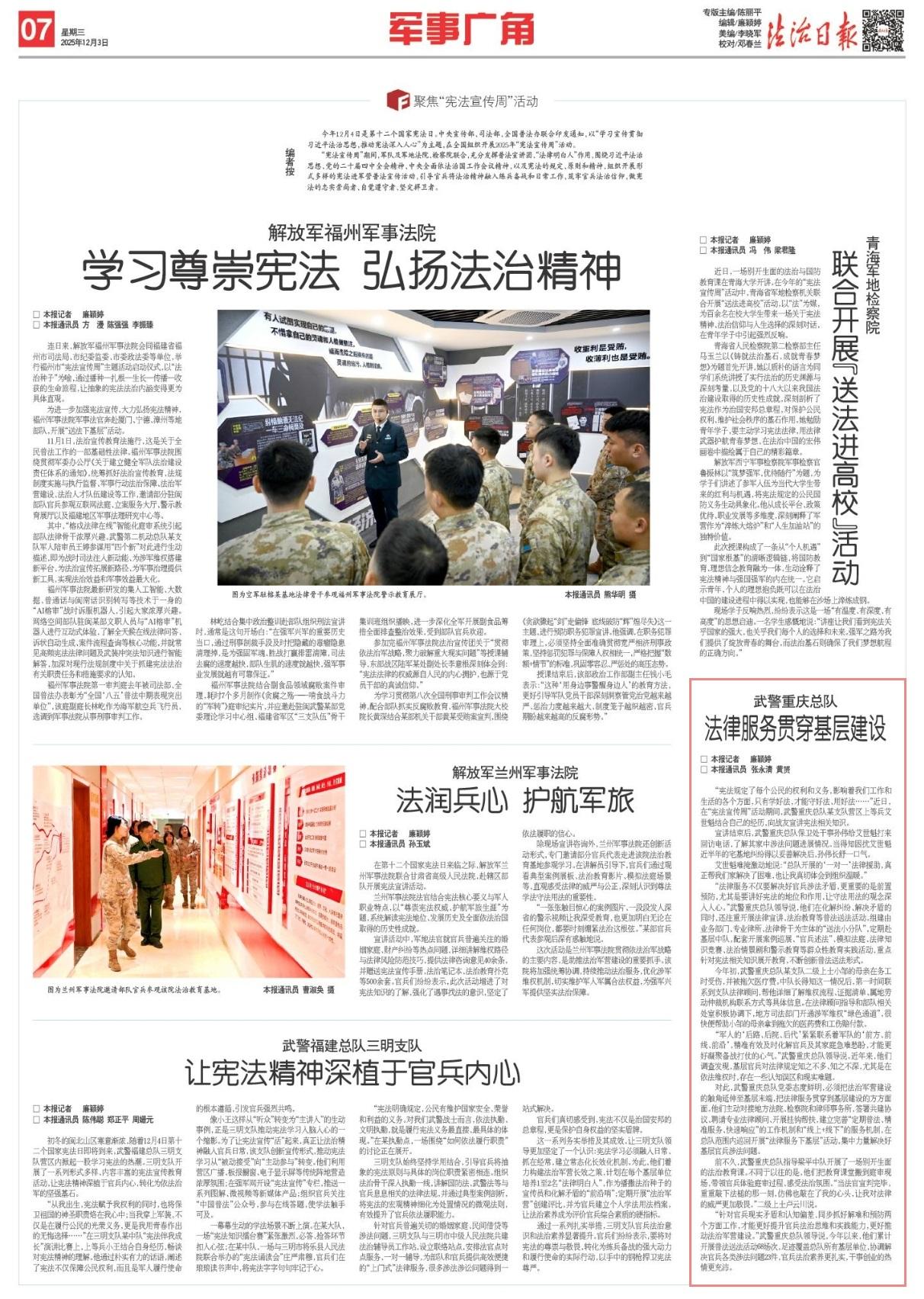 “法律服務(wù)不僅要解決好官兵涉法矛盾,更重要的是前置預(yù)防,尤其是要講好憲法的地位和作用,讓守法用法的觀念深入人心。”武警重慶總隊領(lǐng)導(dǎo)說,他們在化解糾紛、解決矛盾的同時,還注重開展法律宣講、法治教育等普法送法活動。組建由業(yè)務(wù)部門、專業(yè)律所、法律骨干為主體的“送法小分隊”,定期赴基層中隊,配套開展案例巡展、“官兵述法”、模擬法庭、法律知識競賽、法治情景劇和警示教育等群眾性教育實踐活動,重點針對憲法相關(guān)知識展開教育,不斷創(chuàng)新普法送法形式。
