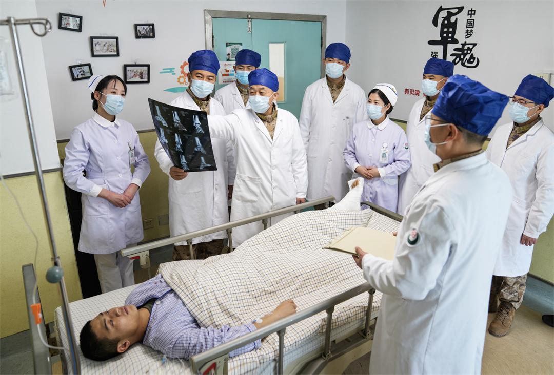 圖為博士團(tuán)隊(duì)在病房里為戰(zhàn)士會(huì)診,研究軍事訓(xùn)練傷防治。張永進(jìn) 攝