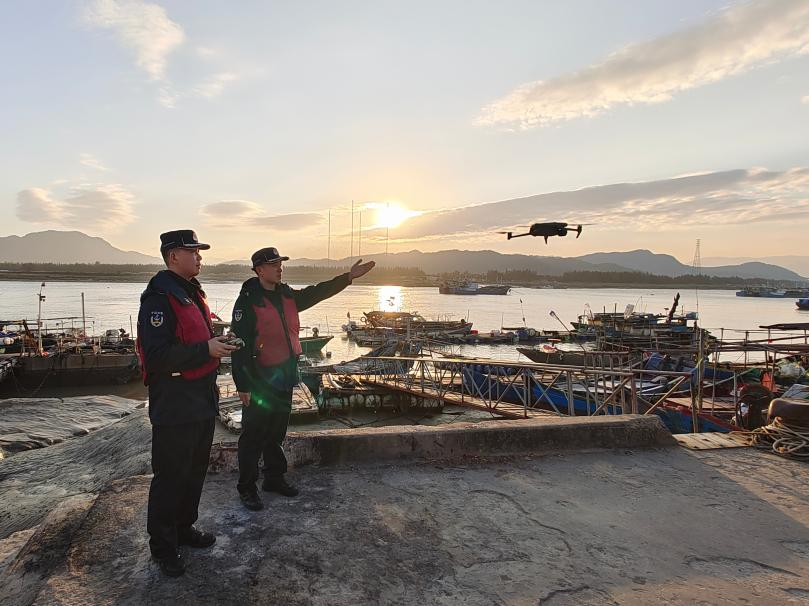 圖為海警執(zhí)法員利用無人機對轄區(qū)漁港岙口進(jìn)行巡查。袁冠卿 攝