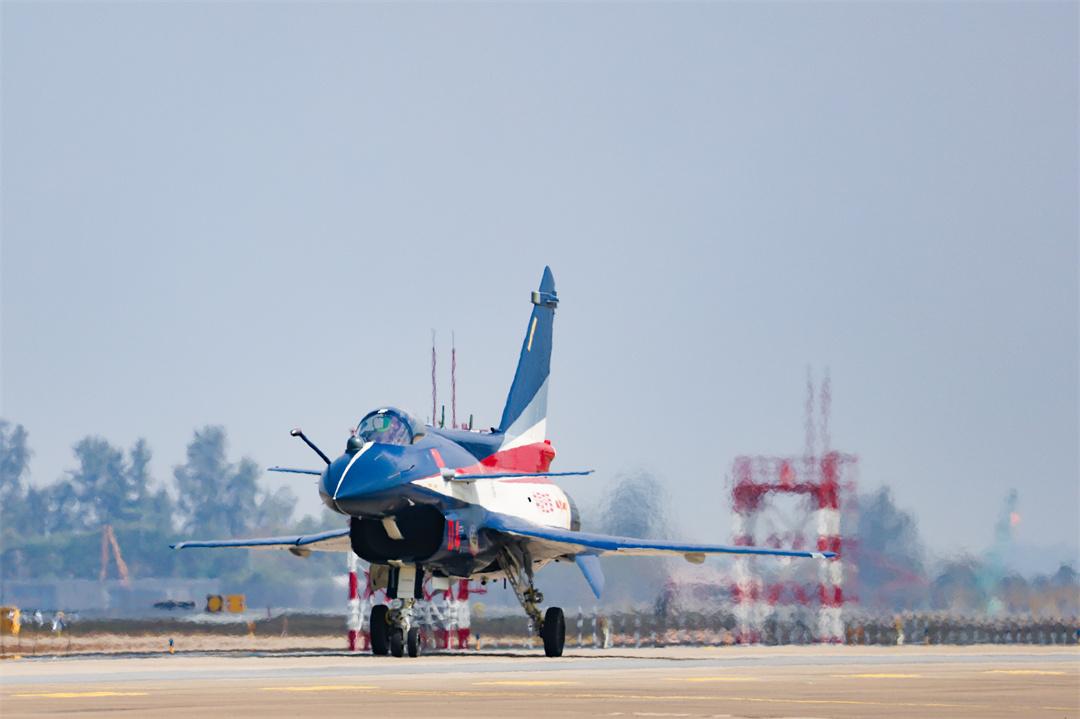 10時許,空軍八一飛行表演隊6架噴涂五星紅旗和八一軍旗的殲-10表演機緩緩滑行至起飛線,編排成2個三機編隊,等待起飛指令下達(dá)。