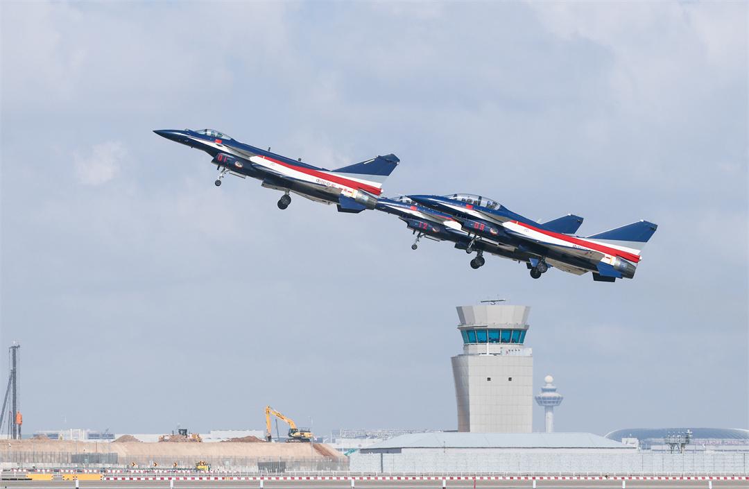 “cleared for takeoff(允許起飛)”,接到塔臺起飛指令后,6架殲-10表演機在云底高600米的條件下,分2批快速滑跑起飛,伴隨著巨大轟鳴聲沖向天際,在空中完成集合編組后,隨即飛往機場附近海面上空。