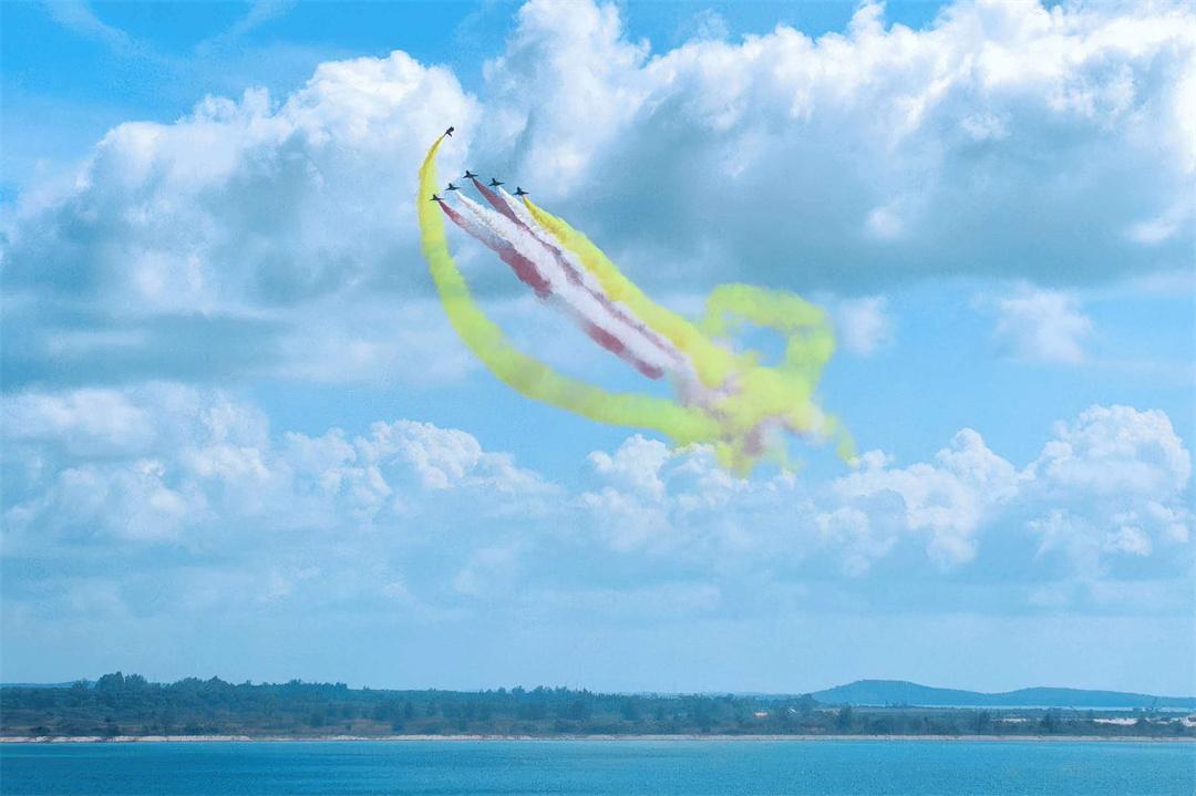 抵達(dá)表演空域后,6架殲-10表演機率先進(jìn)行六機超密集編隊通場,拉出象征中新兩國國旗顏色的紅、黃、白三色彩煙,低空掠過海面。六道彩色航跡猶如彩虹一般,勾勒出優(yōu)美多姿的軌跡。隨后,五機、四機、雙機、單機等特技動作有序銜接,編隊整齊劃一、動作流暢緊密。