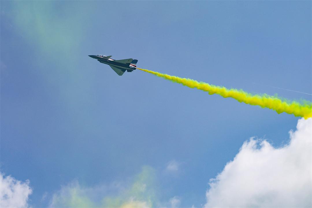 最后一個(gè)表演動(dòng)作是五機(jī)編隊(duì)在空中同步分散,彩煙勾勒出“開花”軌跡。
