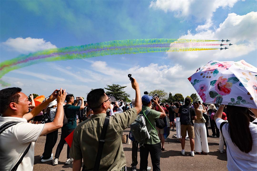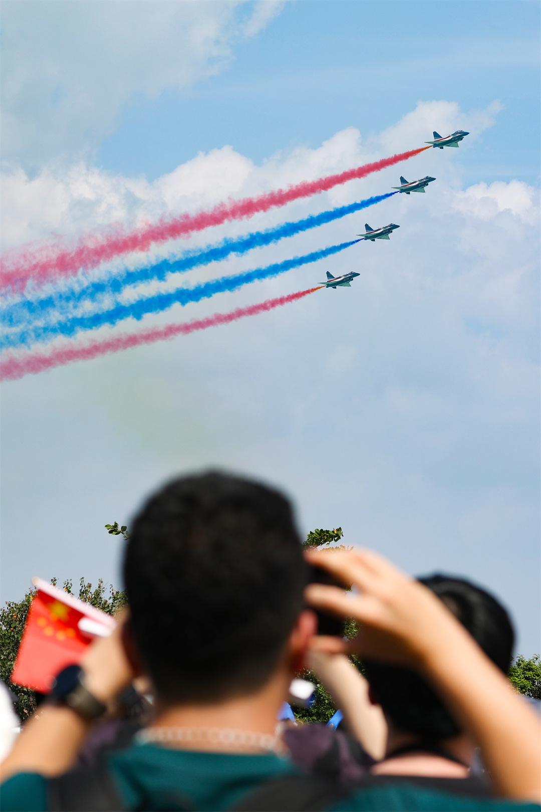 隨后,六機(jī)、五機(jī)、四機(jī)、單機(jī)等一系列高難度動(dòng)作連貫呈現(xiàn),每一次翻轉(zhuǎn)、每一處銜接、每一個(gè)姿態(tài)都精準(zhǔn)利落、一氣呵成,充分展現(xiàn)飛行員精湛的飛行技術(shù)和戰(zhàn)機(jī)優(yōu)異性能,引得現(xiàn)場觀眾陣陣歡呼。