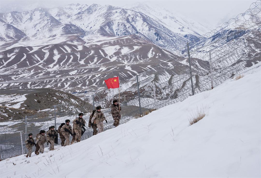 圖為斯姆哈納邊防連官兵與吉根鄉(xiāng)護(hù)邊員在邊防線(xiàn)上一起執(zhí)行巡邏任務(wù)。