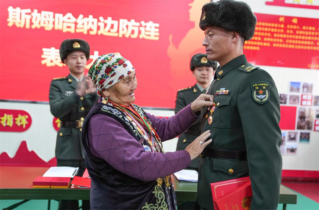 “布茹瑪汗·毛勒朵老大媽和我們連隊(duì)一起,在這片高原上守了六十多年。她是我們的‘母親’,我們是她的‘兵娃子’?!边B隊(duì)指導(dǎo)員敬劉威介紹,“今天連隊(duì)召開(kāi)表彰大會(huì),專(zhuān)門(mén)請(qǐng)她來(lái)為立功的戰(zhàn)士頒獎(jiǎng)?!?/p>