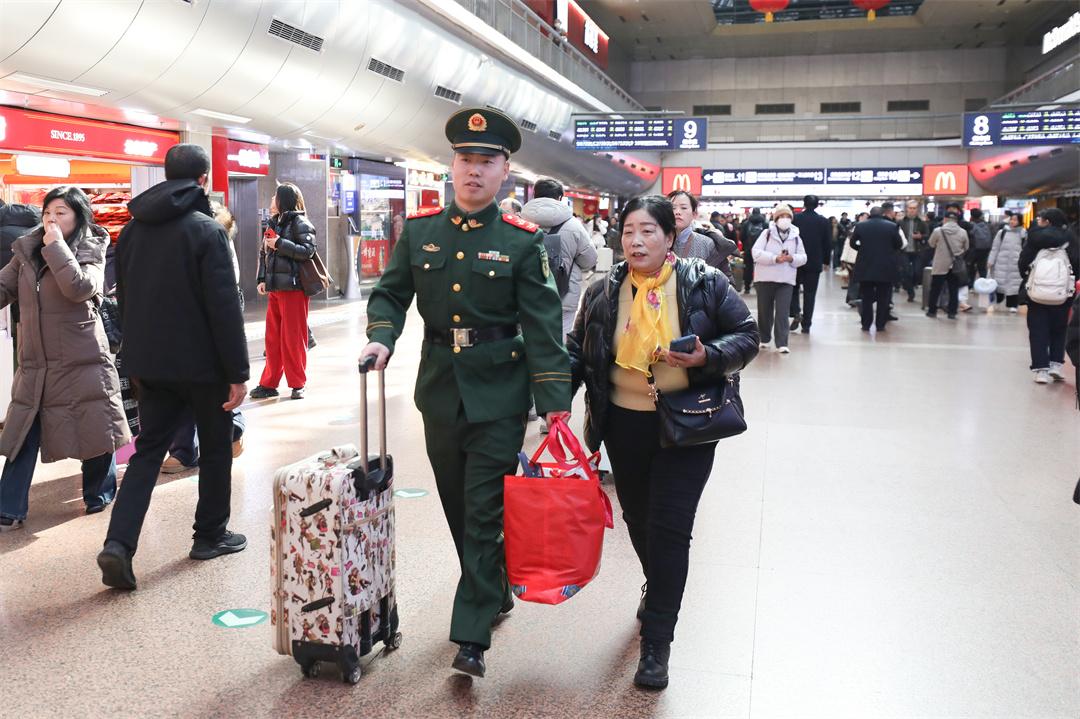 在人員密集的車站進(jìn)站口、安檢區(qū)、候車大廳、檢票口等關(guān)鍵點(diǎn)位,官兵們始終保持高度警惕,緊盯旅客動態(tài),細(xì)致排查各類安全隱患。遇有攜帶大件行李的旅客、行動不便的老人或身有殘疾的特殊旅客,官兵們第一時(shí)間主動上前,接過沉重的行囊,耐心引導(dǎo)至候車專區(qū)、綠色通道,協(xié)調(diào)車站工作人員開通“返鄉(xiāng)優(yōu)先通道”,全程幫扶特殊旅客進(jìn)站乘車。