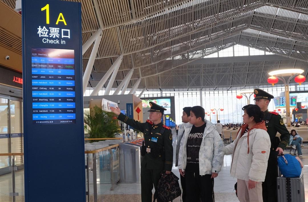 2月15日早晨,北京朝陽站人流如織。武警北京總隊執(zhí)勤第八支隊某中隊班長廖威望正帶著前往沈陽探親的劉大爺去相應(yīng)候車區(qū)。
