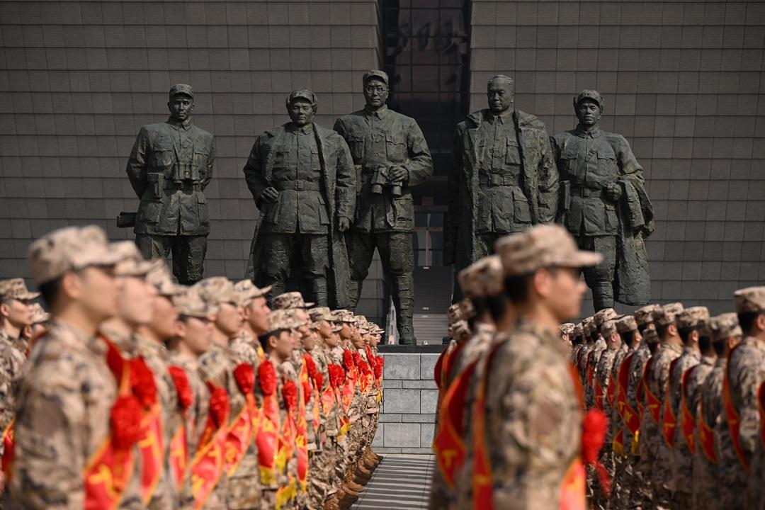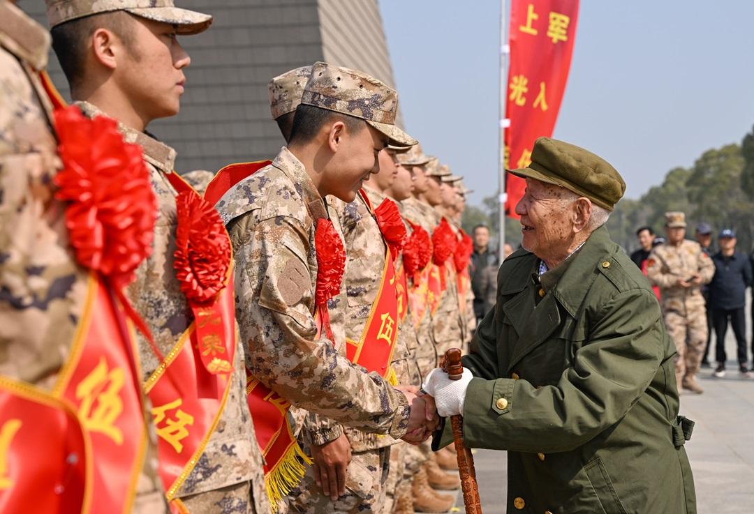 3月13日,安徽省合肥市舉行2026年上半年新兵入伍歡送儀式。圖為在渡江戰(zhàn)役紀(jì)念館解放廣場,身著迷彩服、胸前佩戴大紅花的新戰(zhàn)士整齊列隊,帶著父老鄉(xiāng)親的囑托,奔赴軍營建功立業(yè)。