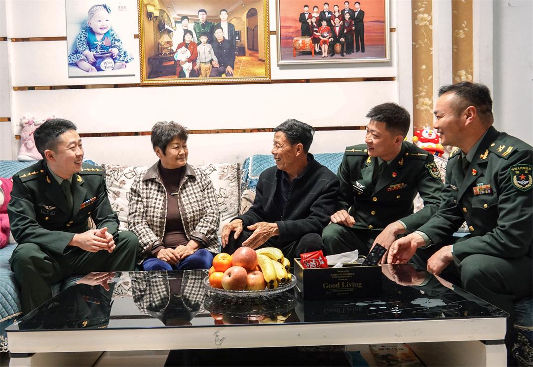 圖為部隊官兵來到申亮亮家中看望英雄父母,與老人親切交談。