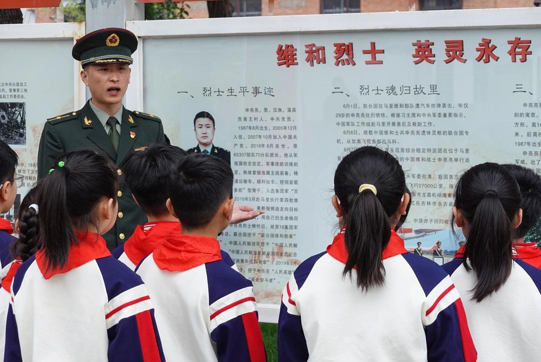 該旅駐地烈士陵園,每年有數(shù)萬人次來到這里,緬懷為維護世界和平犧牲的“人民英雄”。講解員張碩對前來參觀的學生們說:“申亮亮是部隊的英雄,也是我們心中的英雄?!?/p>