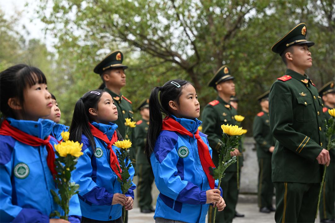 圖為官兵和學(xué)生們向烈士獻(xiàn)花。